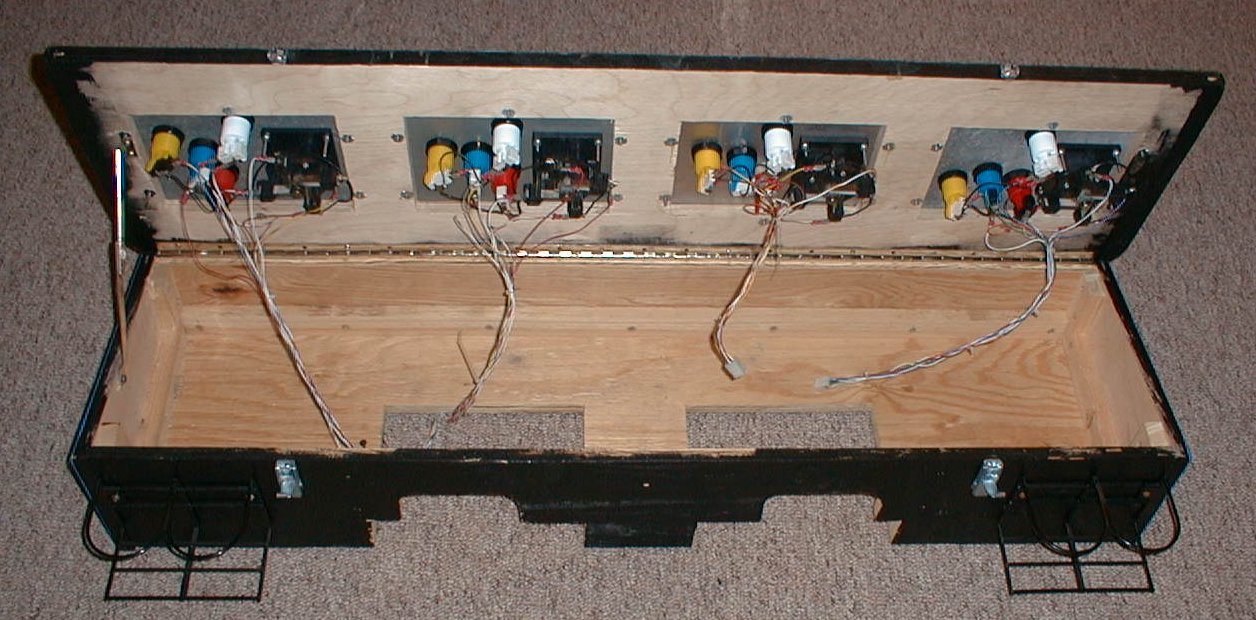 Four 7"x9" holes were cut in the top of the control panel to drop in 8x10 control pods. I had many ideas of how to implement keeping the control pods in place and yet have them easily removable, but eventually I settled with just having them attached with screws which drilled into t-nuts mounted in the control panel. A large hinge was added to the front of the control panel to allow access.