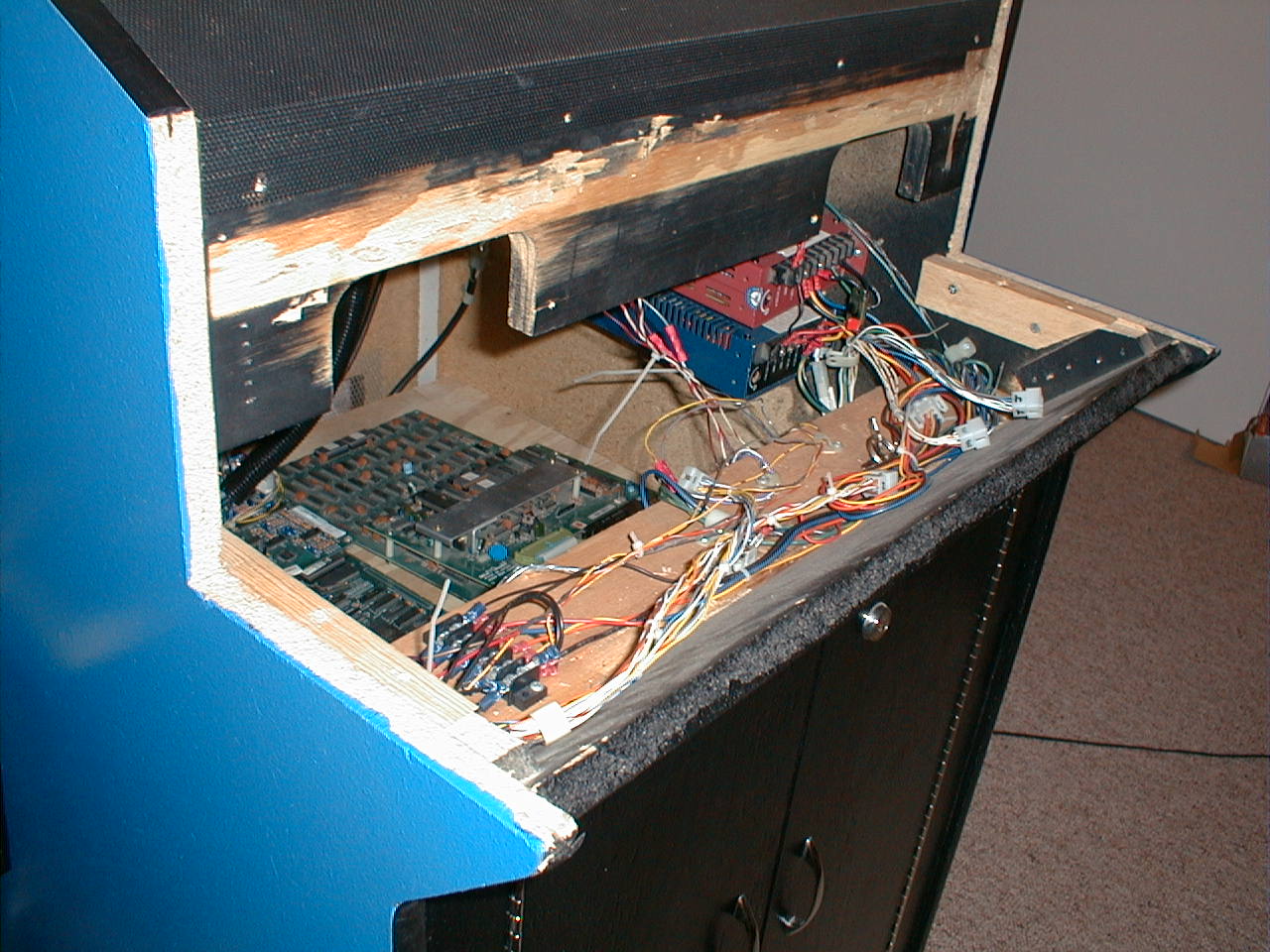 We took his basic design, and Rick talked about all the things he'd wish he had done. The things we fixed included moving the power supply to the upper part of the cabinet above the boards so there would be more room for boards and easy access to adjusting the +5VDC, making a deeper control panel to support things like analog joysticks and such, and left some space in between the doors and shelves for the JAMMA harness.