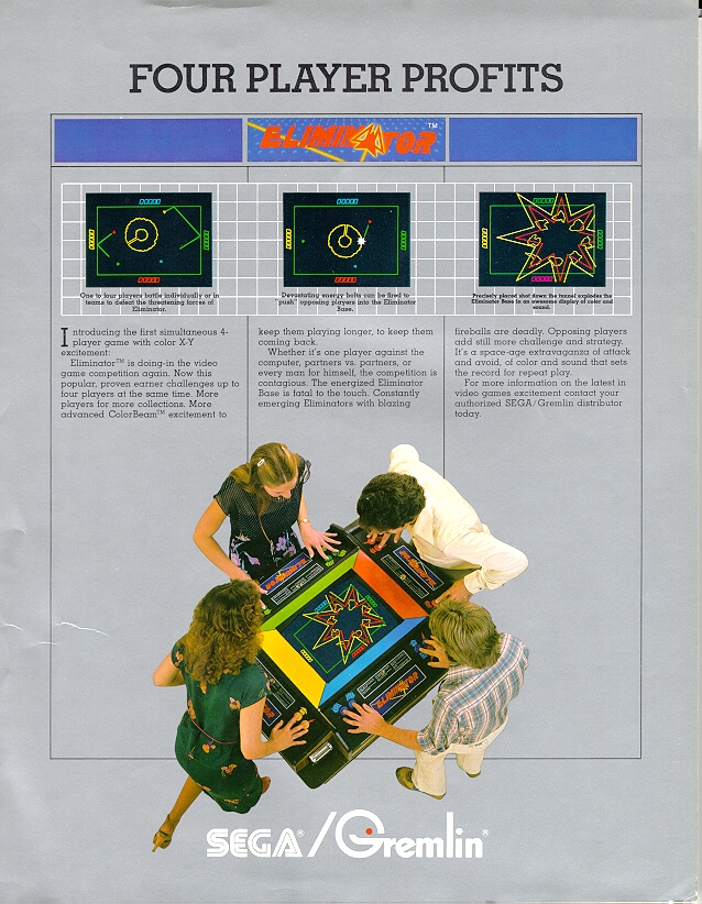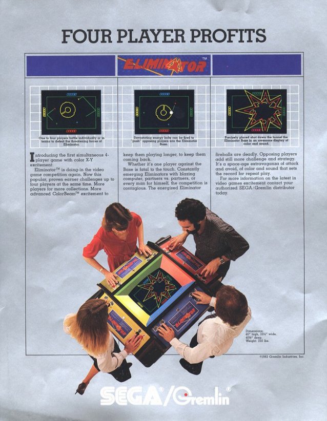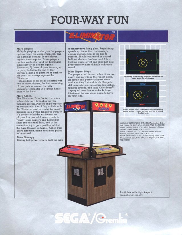 "Four against one is fair play when that one is the mighty Eliminator--a large spheroid that floats randomly about the video screen. This Eliminator is invulnerable except through a narrow passage (it's throat?) to its core. During the game, the Eliminator sends out ships bent on destroying the up-to-four players (who can choose to work alone or in teams of two). You and your fellow players, while avoiding Eliminator ships, attempt to force opposing players' spaceships (with energy bolts that push objects) into a deadly collision with the Eliminator base. The lone surviving player must then fire down the Eliminator's throat to win the game."